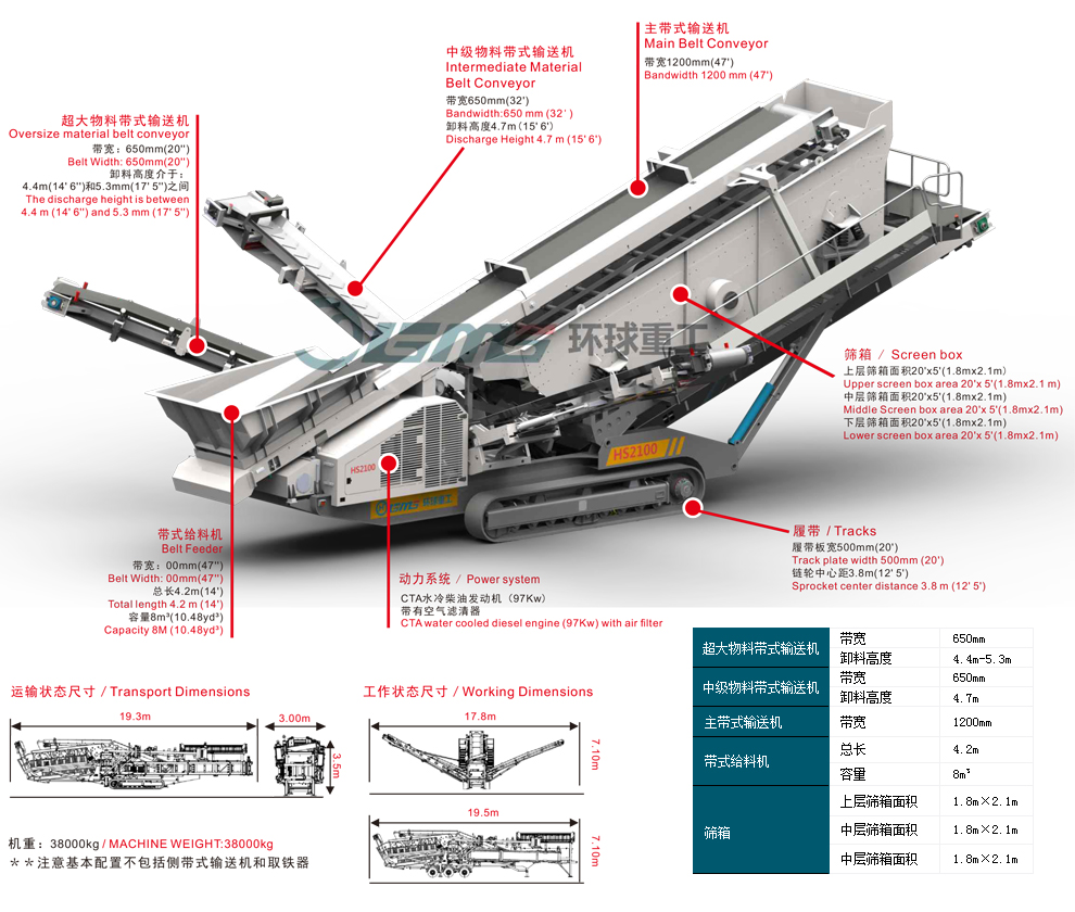 新型HS系篩分機是業(yè)內(nèi)領先的履帶移動式傾斜篩分設備,具有最佳的生產(chǎn)水平,最短的安裝時間和最便捷的操作。大容量的帶式給料機配備有可遙控翻轉的網(wǎng)格篩或單/雙層振動網(wǎng)格篩。全新的三層篩分結構安裝有三層尺寸為20'x5'(6.1mx1.525m)的篩網(wǎng)。創(chuàng)新的液壓控制系統(tǒng)可使四級輸送帶在堆料和送料時做簡單的位置調(diào)節(jié)。