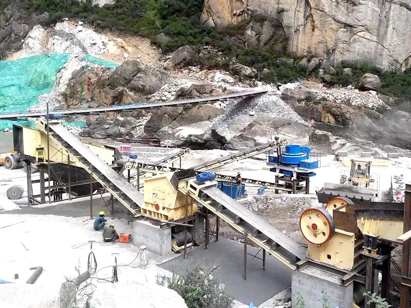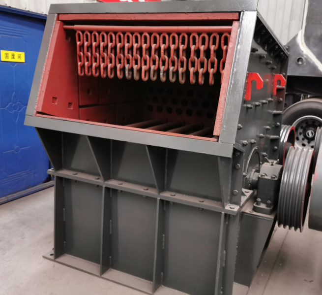 原料經(jīng)過鏟車,挖掘機等設備被送入料倉,料倉中的料進入篩分喂料機,其中原料中粒度符合要求的部分從篩孔處漏下而后經(jīng)由出土皮帶機直接形成土堆;尺寸較大的物料則通過篩分喂料機進入反擊式破碎機進行破碎,而后當粒度大小達到標準后從出料口排出進入振動卸料機;卸料機將物料均勻送入主卸料皮帶機,皮帶機將物料輸送出去形成料堆;同時在主卸料皮帶的上方安裝有除鐵器,物料中的鐵質經(jīng)除鐵器吸合后被分離。
