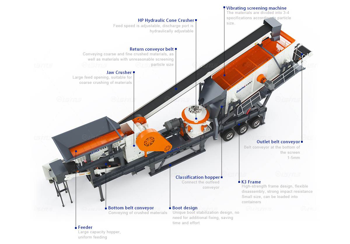 移動鄂破+圓錐破破碎篩分一體機也是采用的加長車身,在這臺車上配置的破碎設(shè)備是顎破機和圓錐破,使用顎破來實現(xiàn)石料的粗破,然后使用輸送帶把破碎后的物料送到振動篩篩分一次,把大塊的料篩出來,落在圓錐破的進料口,使用圓錐破再破碎一次,然后再經(jīng)巡輸送帶返回振動篩再篩分一次。篩分的同時可以把細料與其它的碎料都篩分出來分別送到不同的料堆,一臺振動篩同時篩分出來四種物料,有石子,沙子,粗沙,等等。